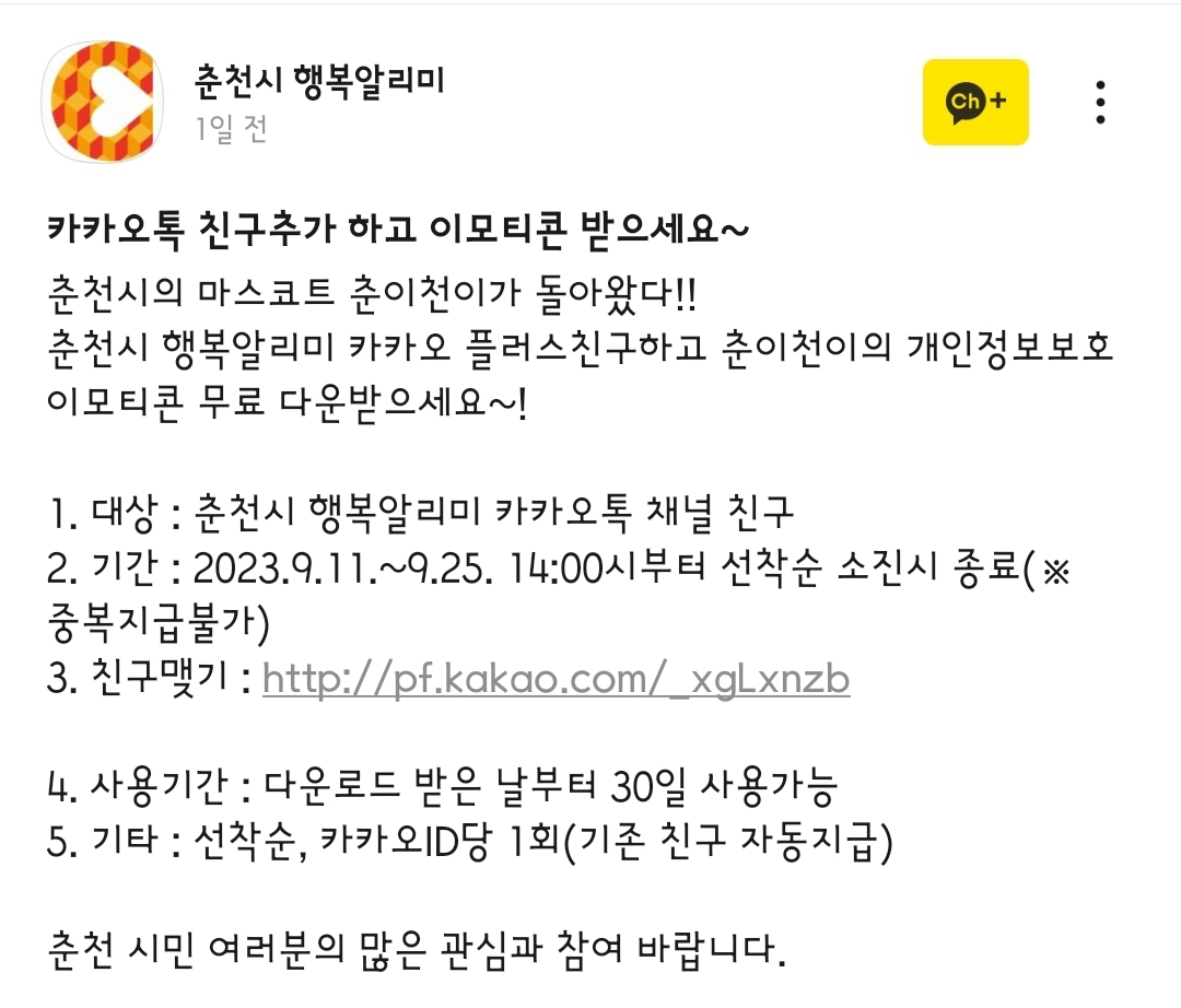 카톡 "춘천시" 채널에서 주관하는